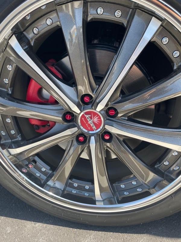 ホイールナットを交換しました。赤いパーツは足元が引き締まります。専用のレンチが必要なためロックナットになります。
