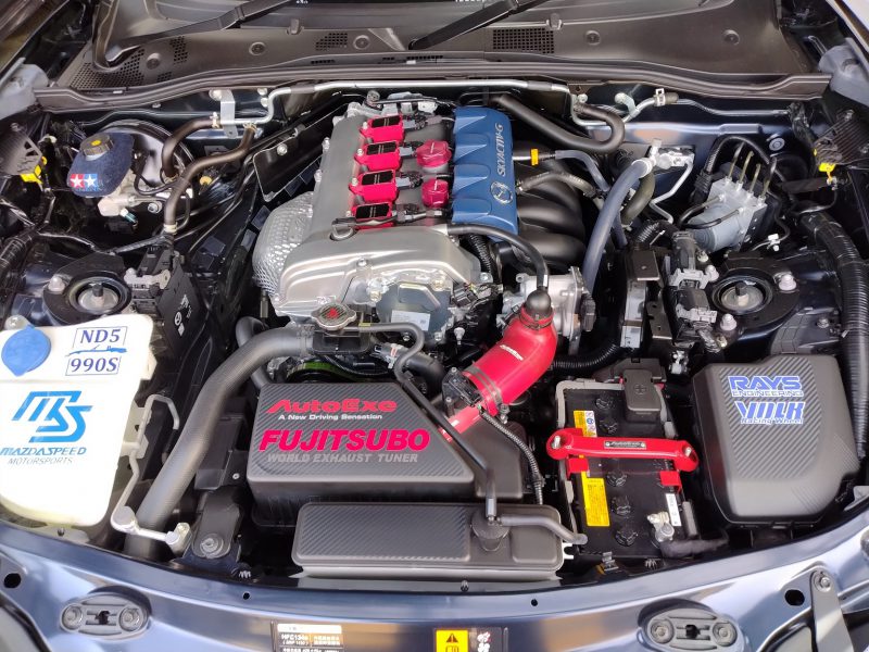 エンジンルームは、AutoExeパーツのレッド & 990Sのイメージカラーのブルーでカラーコーディネート(カラーチューン……⁈)を施しています。