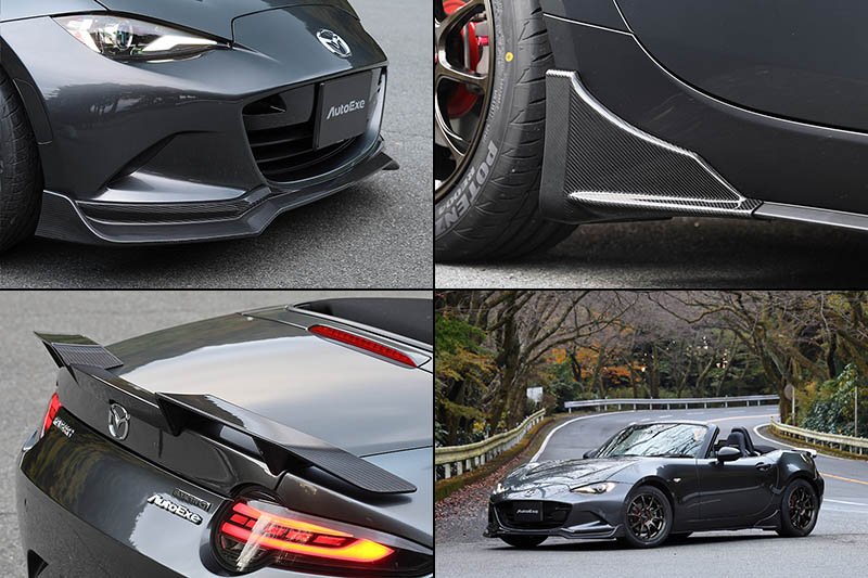今回先行発売となるスタイリングキットは「フロントアンダースポイラー」「サイドストレーキ」「リアウイング」の3点。本格CFRP(ドライカーボン)を採用し、軽さと高剛性を両立させた仕様です。深みのあるクリアコーティングが立体造形を際立たせ、ロードスターの“人馬一体感”をよりソリッドかつ上質に引き締めます。