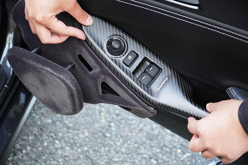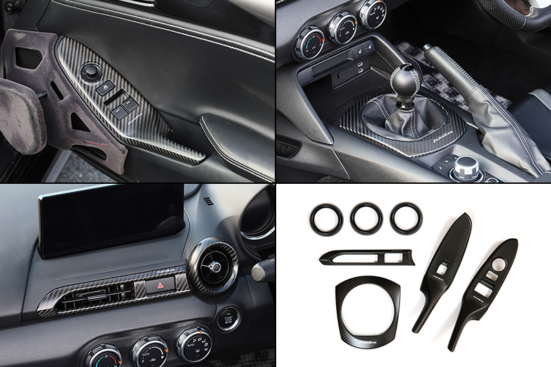 パワーウインドウ部やシフトパネル部など、室内の複数個所に装着する「カーボンインテリアパネルセット」は、軽量かつ高剛性のドライカーボン(CFRP)を採用。