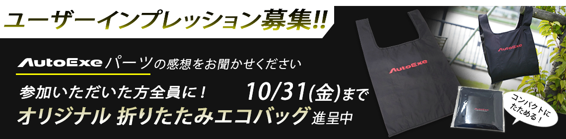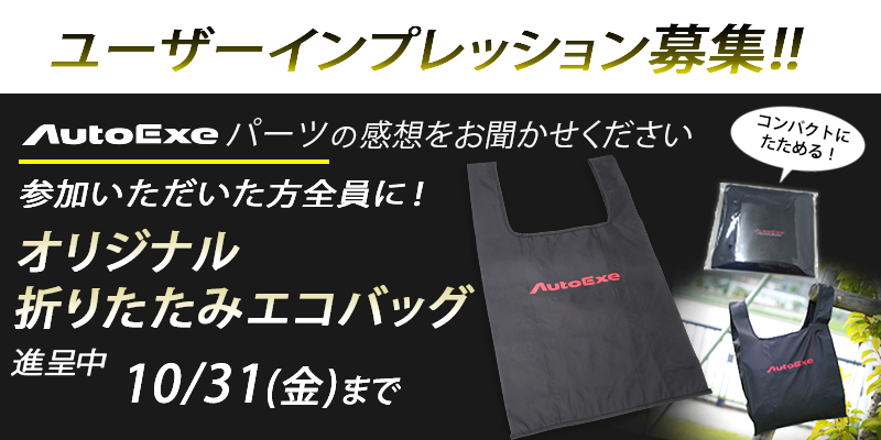 オートエクゼでは、10/1~10/31の間、期間限定キャンペーンを行っております。期間中にパーツインプレッションをご投稿いただいた方全員に、新ノベルティ「オリジナル 折りたたみエコバッグ」をプレゼントさせていただきます。サスペンションやマフラーといった機能部品からアクセサリーまで、どんな製品でもOKです!この機会に、皆さまの体感エピソードをお聞かせください。