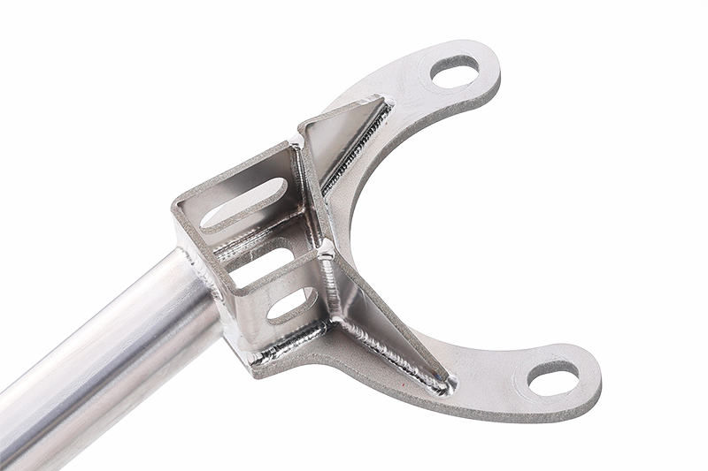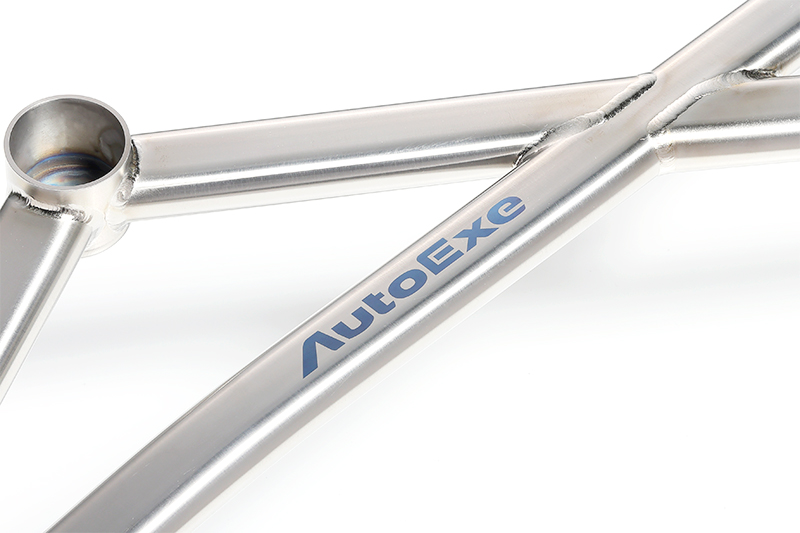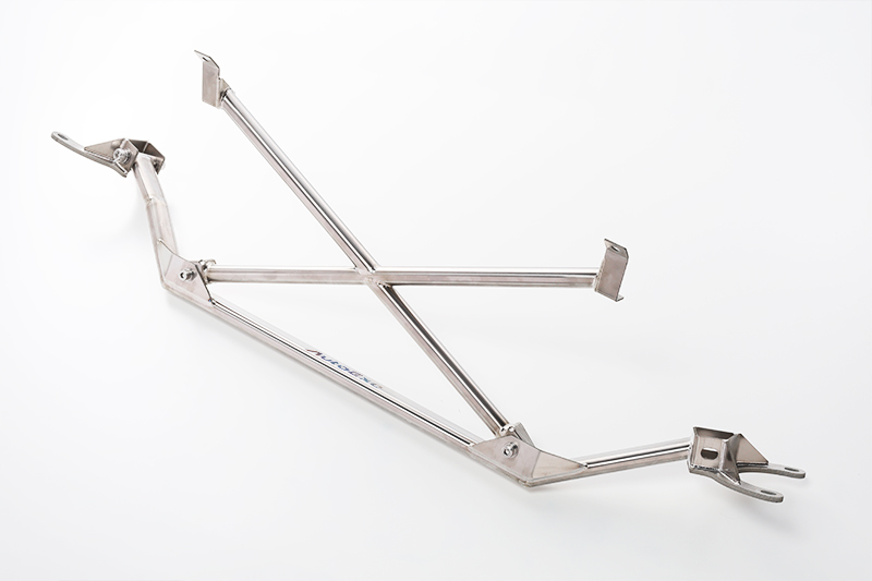 ストラットタワーバー(チタン) 量産比96%の重量と質感を両立する純チタン製。バーリング加工ガセットと溶接ワンピースクロスバーを採用し、スチール製に迫る剛性を発揮する。 (2.0kg)