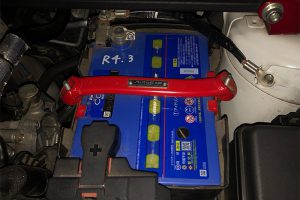 ■バッテリークランプ  エンジンルームに遊び心を。AutoExe製ストラットタワーバーをイメージにデザインされたワンピーススチール製。鮮やかなレッドカラーやロゴプレートに至るまで忠実に再現した。