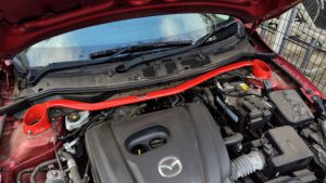 新型車専用設計品。彫の深さが際立つ水平基調のフィンタイプ。表面にピアノブラック、凹部に艶消しブラック塗装を施しマツダエンブレムをトレードイン。