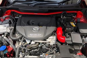 ストラットタワーバーやフロアクロスバーでは補えないボディモノコック中央部付近の歪みを抑制し、SKYACTIVボディの「環状構造」効果を補う。後席のレッグスペースを極力犠牲にしない低重心レイアウトを心がけている。  >>もっと詳しく