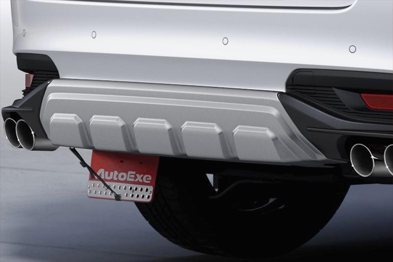 リアアンダーガーニッシュ オーバーライダーをイメージした逞しい造形とボリューム感。リアバンパーに装着しSUVらしいアクティブなスタイルを主張する。シルバーメタリック塗装済み。